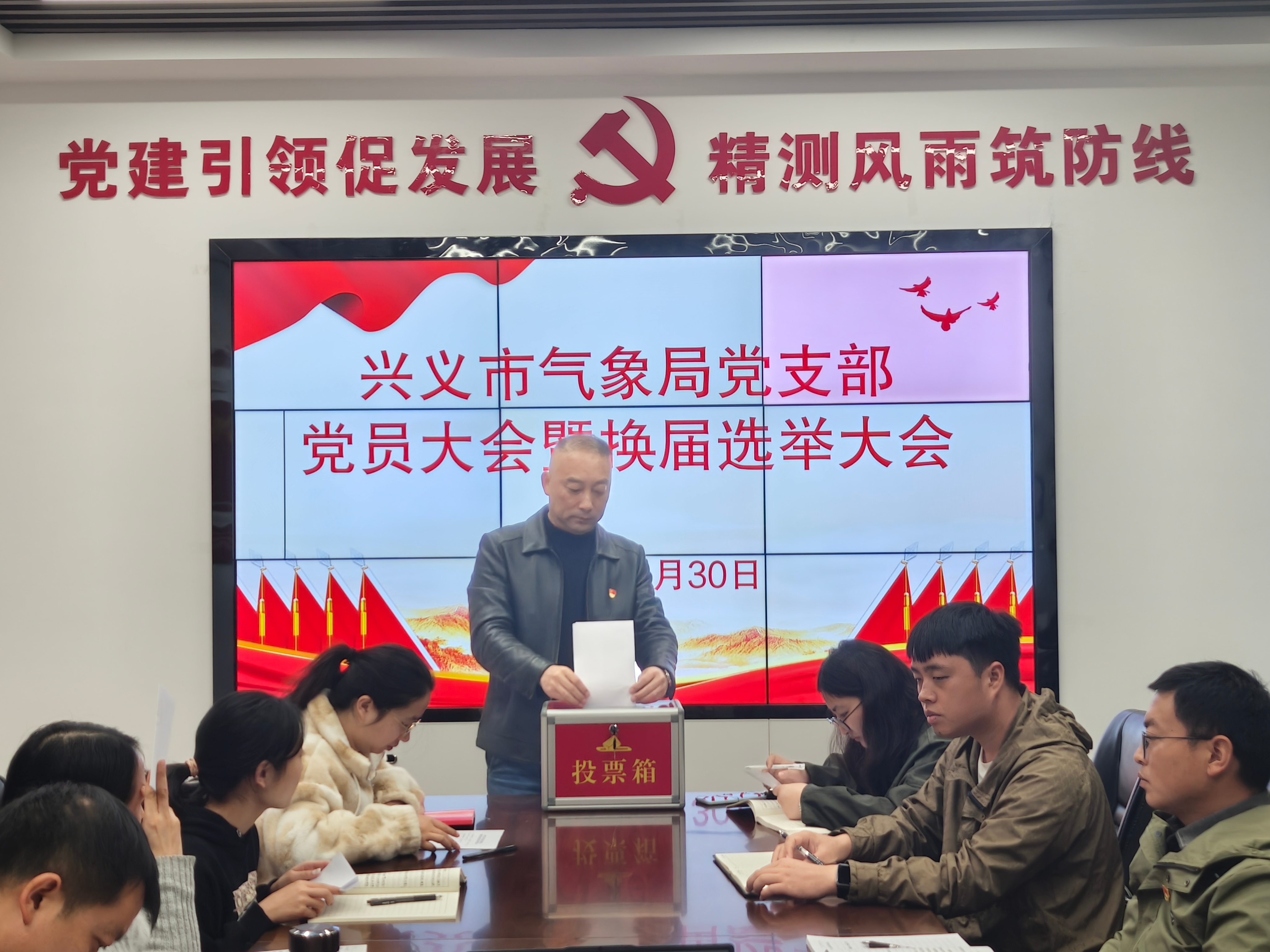 此次换届进一步凝聚了党员共识,增强了党组织活力。下一步,兴义市气象局党支部将以此次换届为起点,深化“党建领航 气润兴义”品牌创建,以高质量党建引领气象高质量发展,护航地方民生与经济社会发展。图为换届选举现场。(张仁兴)