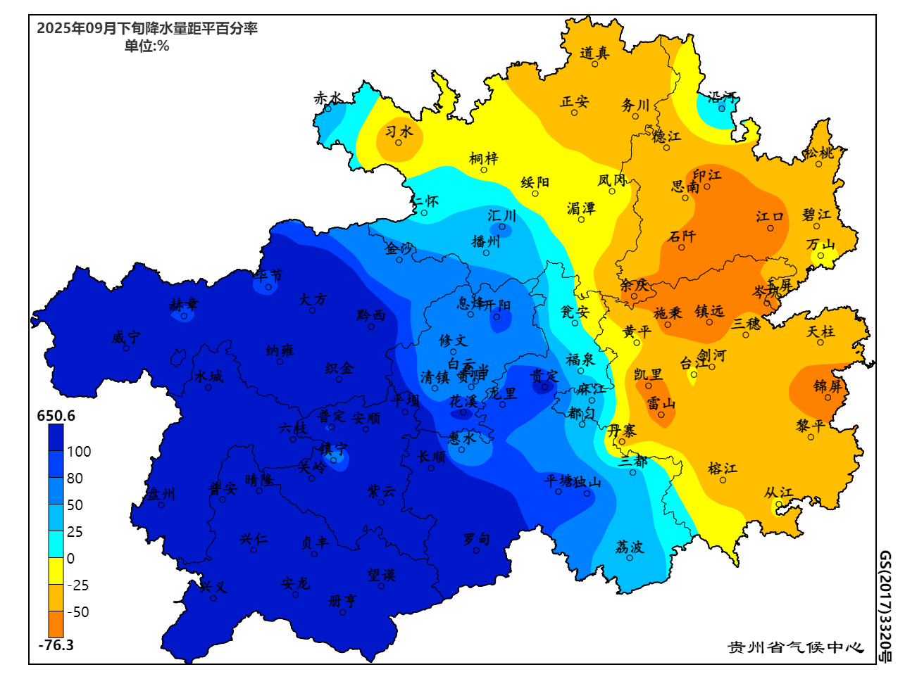 9月下旬,全省平均降水量为53.3毫米,较常年同期偏多80.9%。累计降水量最大为228.2毫米(盘州),省的西部大部和中部局地降水量在50毫米以上(图1)。与常年同期相比,省的东部偏少,省的中部以西地区、沿河和赤水正常~偏多,其中省的西部偏多一倍以上(图2)。