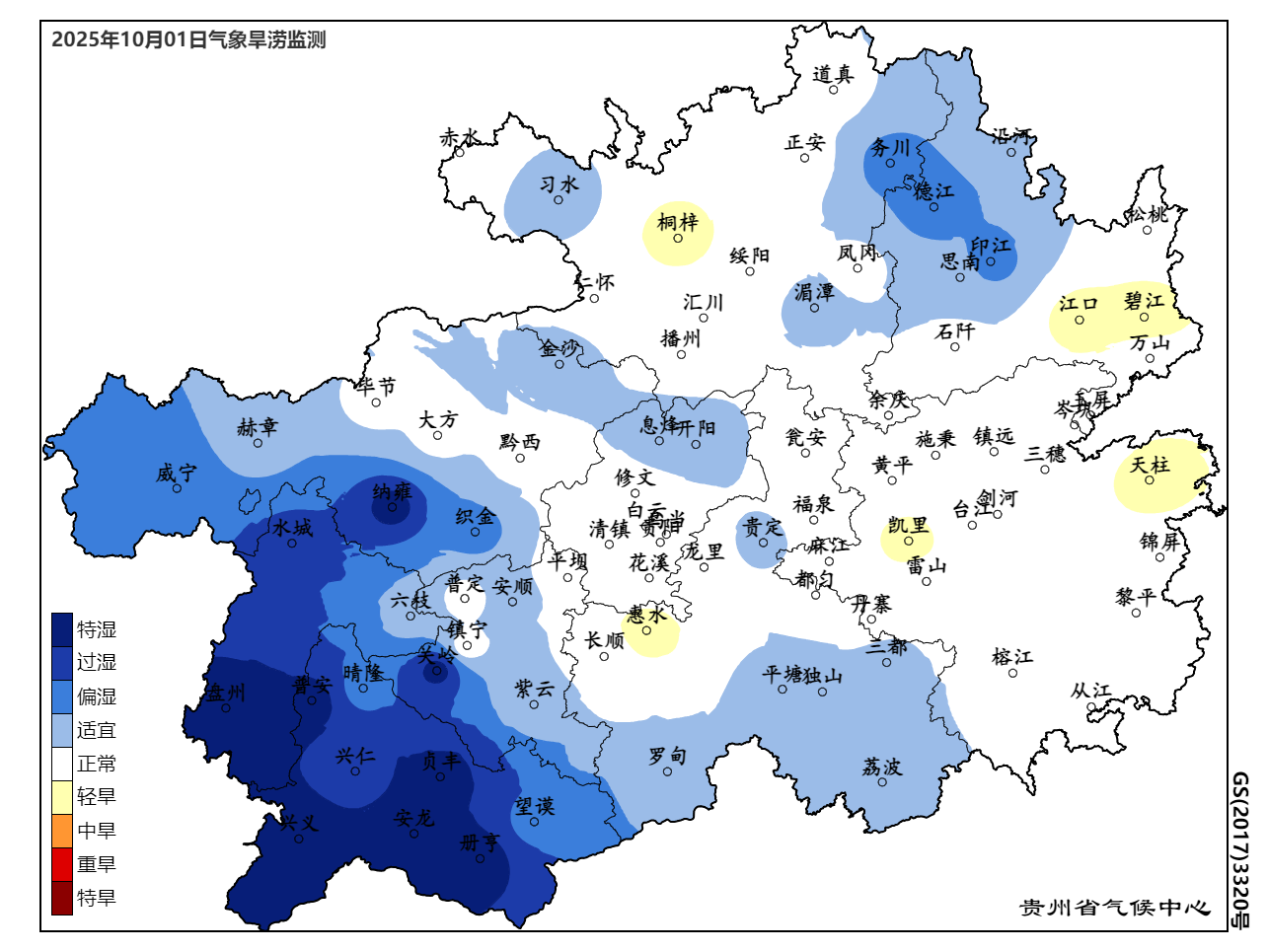 据10月1日气象旱涝监测,全省出现特湿8站(册亨、安龙、兴义、贞丰、关岭、纳雍、盘州、普安),过湿2站(兴仁、水城),偏湿7站(望谟、晴隆、织金、印江、德江、务川、威宁),轻旱6站(惠水、天柱、凯里、碧江、江口、桐梓)。