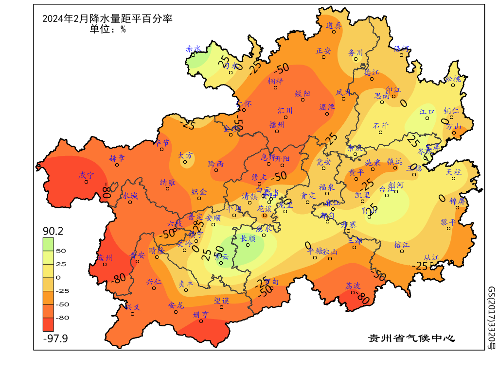 图4 贵州省2024年2月降水量距平百分率(%)