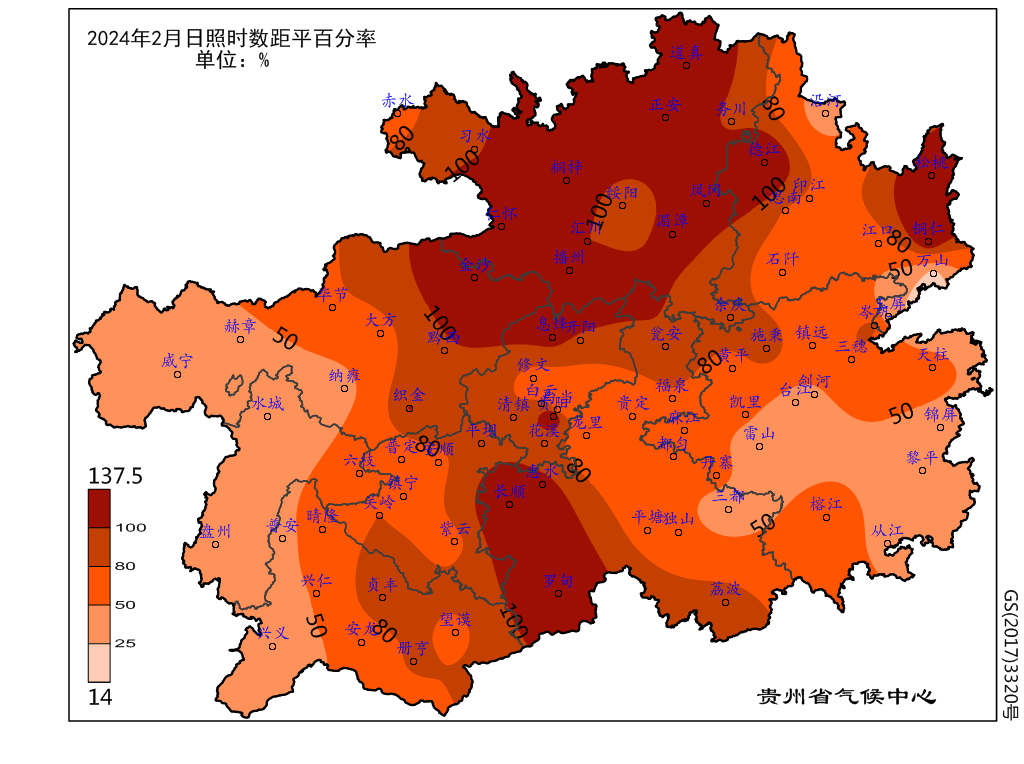 全省日照时数在54.8小时(沿河)~206.1小时(威宁)之间,遵义市大部、铜仁市、黔东南州、黔南州北部和东部、贵阳市北部以及金沙在100.0小时以下,省内其余地区在100.0小时以上(图5);与常年比较,全省一致正常至特多137.5%(德江)(图6)。