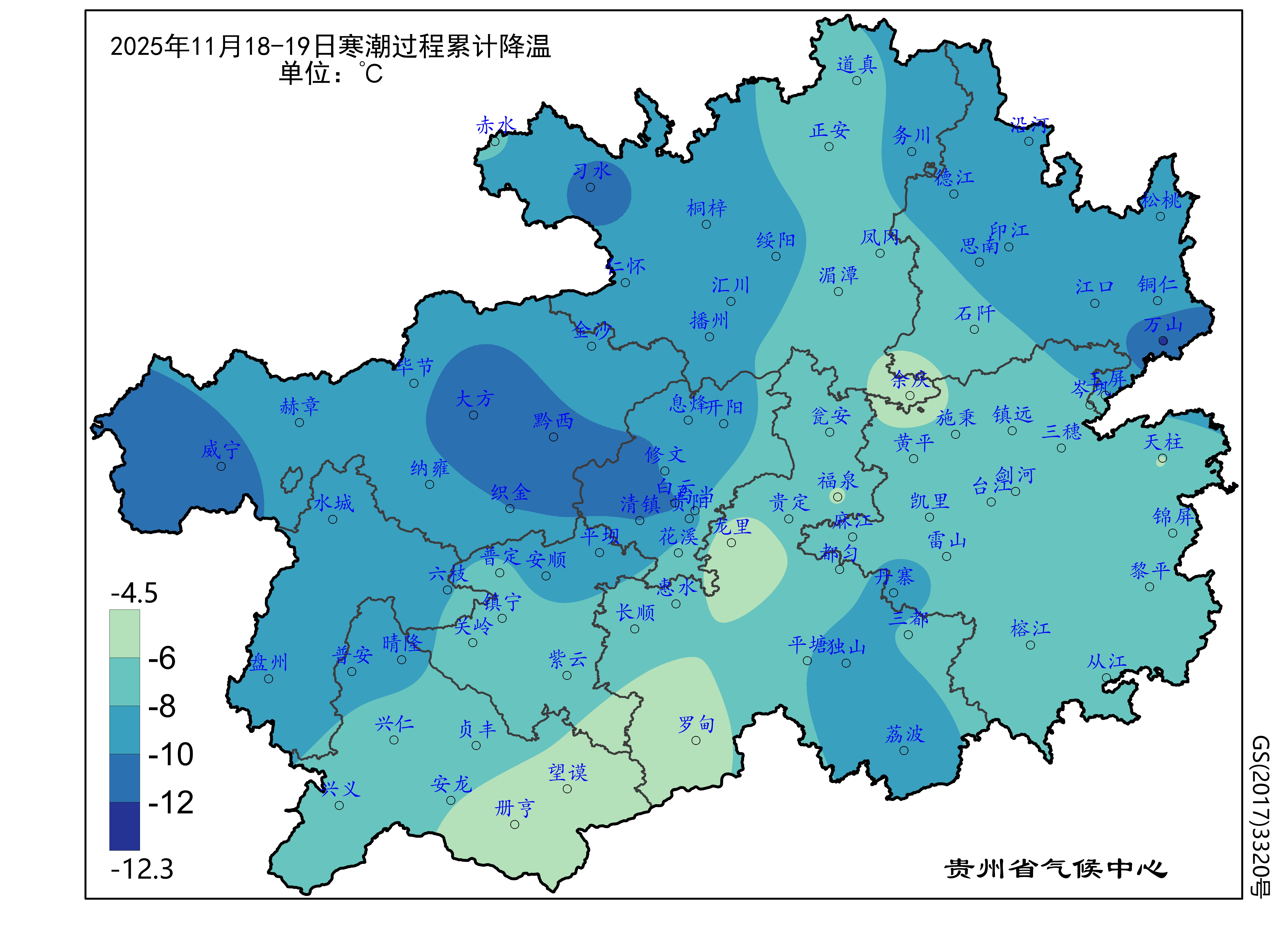 图1 贵州省2025年11月18-19日强降温过程累计降温分布