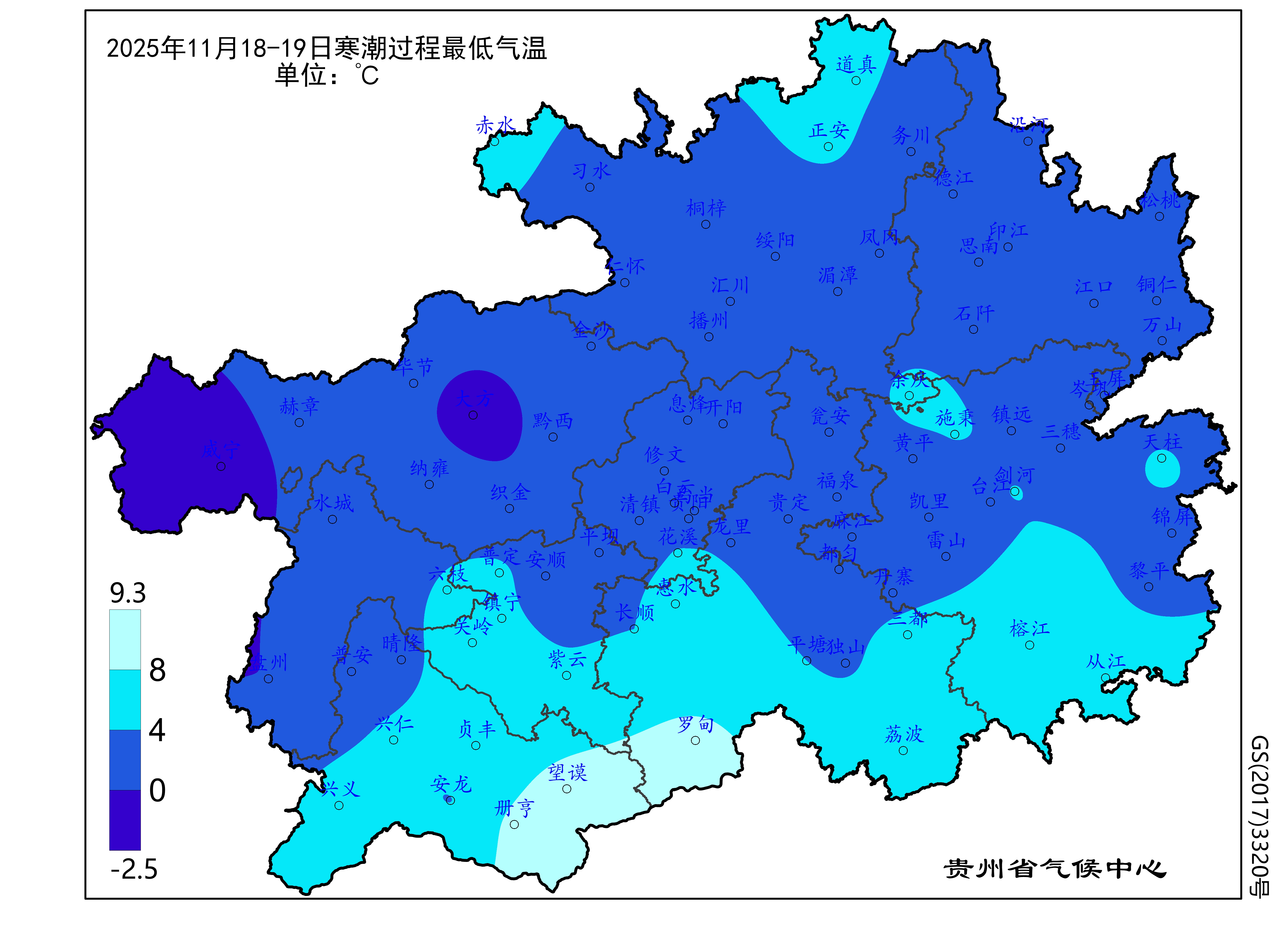 图2 贵州省2025年11月18-19日强降温过程最低气温分布