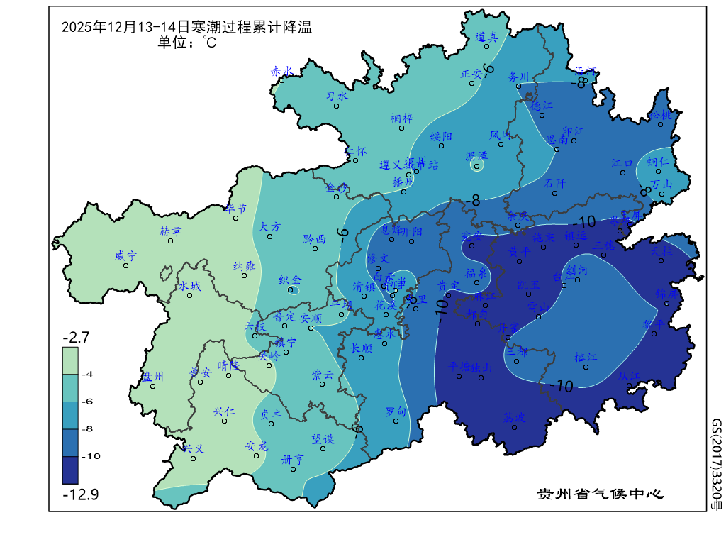 图1 贵州省2025年12月13-14日强降温过程累计降温分布