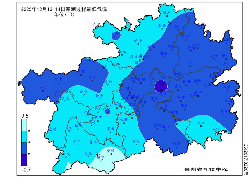 12月13-14日,我省强降温过程最低气温在-0.7℃(瓮安)~9.5℃(望谟)之间,除册亨、望谟、兴义在8.0℃及以上外,其余大部地区在8.0℃以下,其中省的中部以东大部地区、毕节市大部,以及安顺、习水等地在4.0℃及以下。