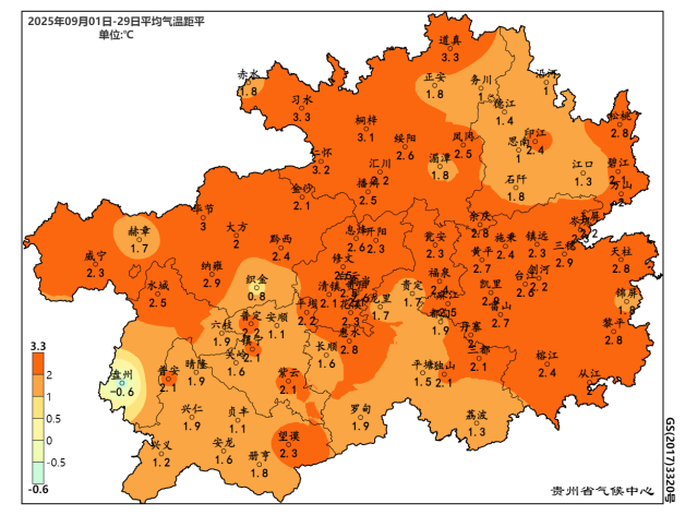 气温偏高,降水偏多:9月,全省平均气温为23.2℃,较常年同期偏高2.1℃,与常年同期相比,除织金偏低外,全省大部地区正常~偏高,其中省的北部大部、中部和东南部偏高2℃以上。全省平均降水量为130.1毫米,较常年同期偏多29.3%,与常年同期相比,黔东南州东北部、桐梓、碧江偏少3成以上,其余地区正常至偏多,省西南部部分地区和铜仁中北部偏多1倍以上。