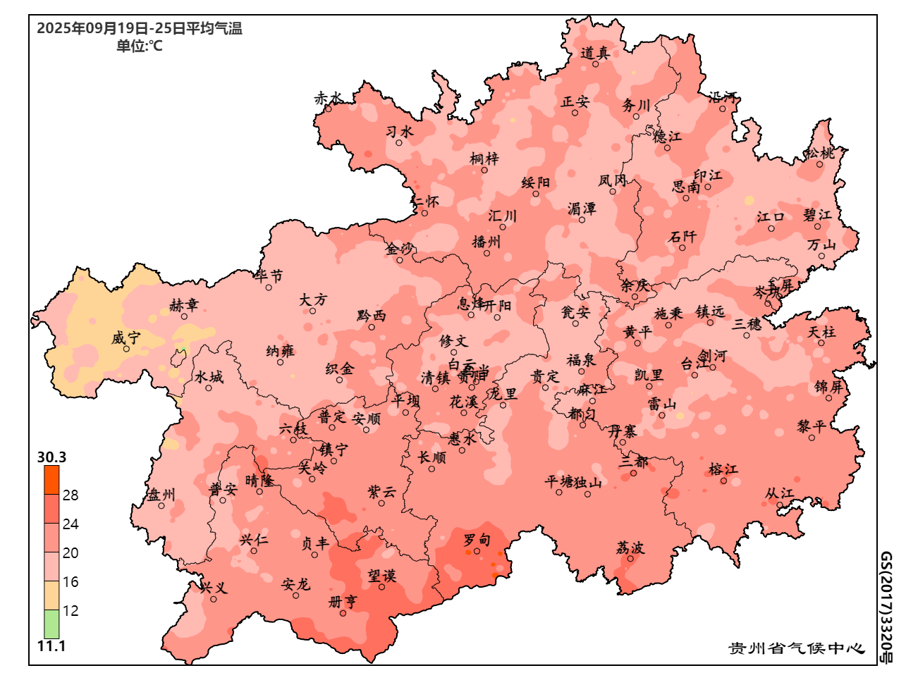 过去一周,全省平均气温为20.7℃,较常年同期偏高0.6℃,各地平均气温在11.1℃(赫章韭菜坪)~30.3℃(罗甸油落寨)之间。与常年同期相比,除省的东部局地略偏低外,其余大部地区正常至偏高,其中省的西南部局地偏高2.0℃以上。