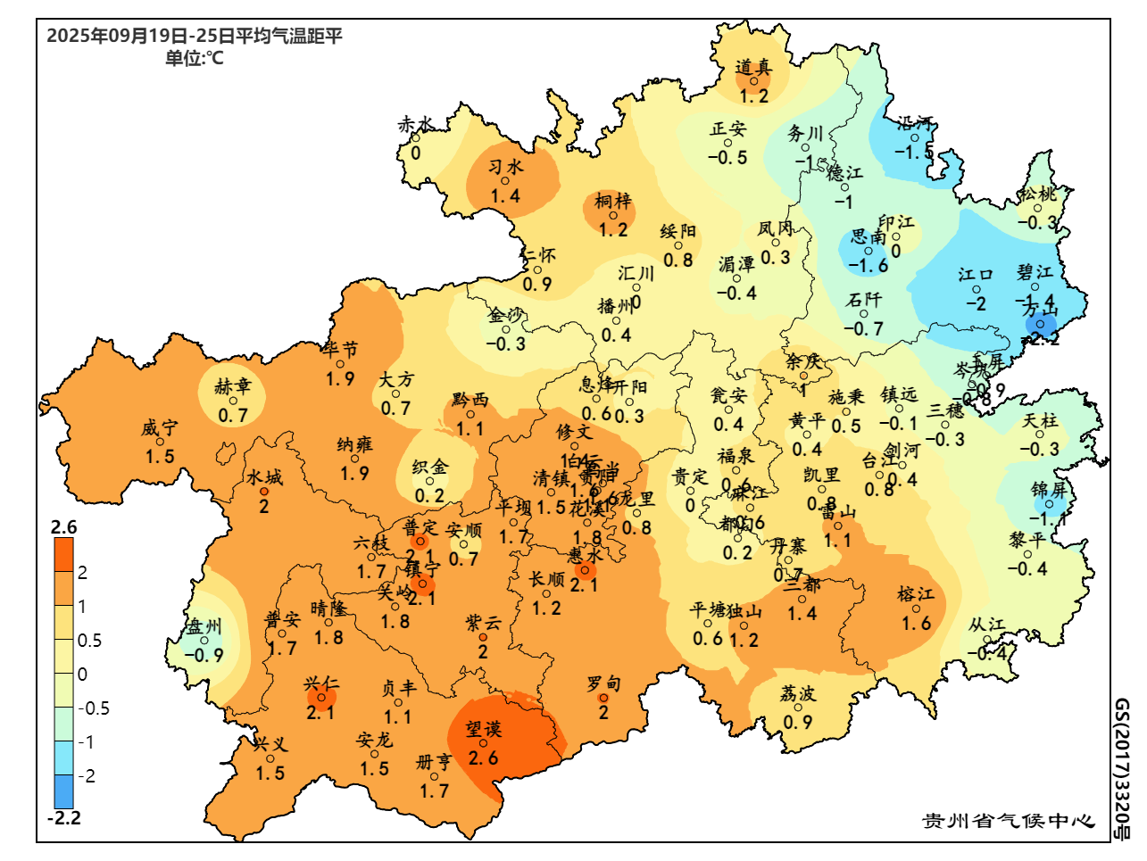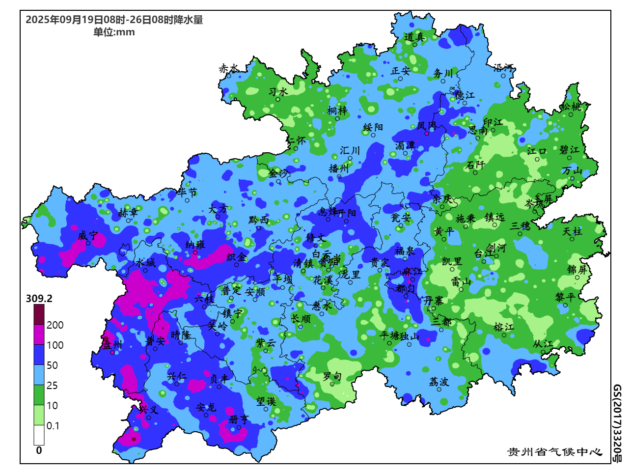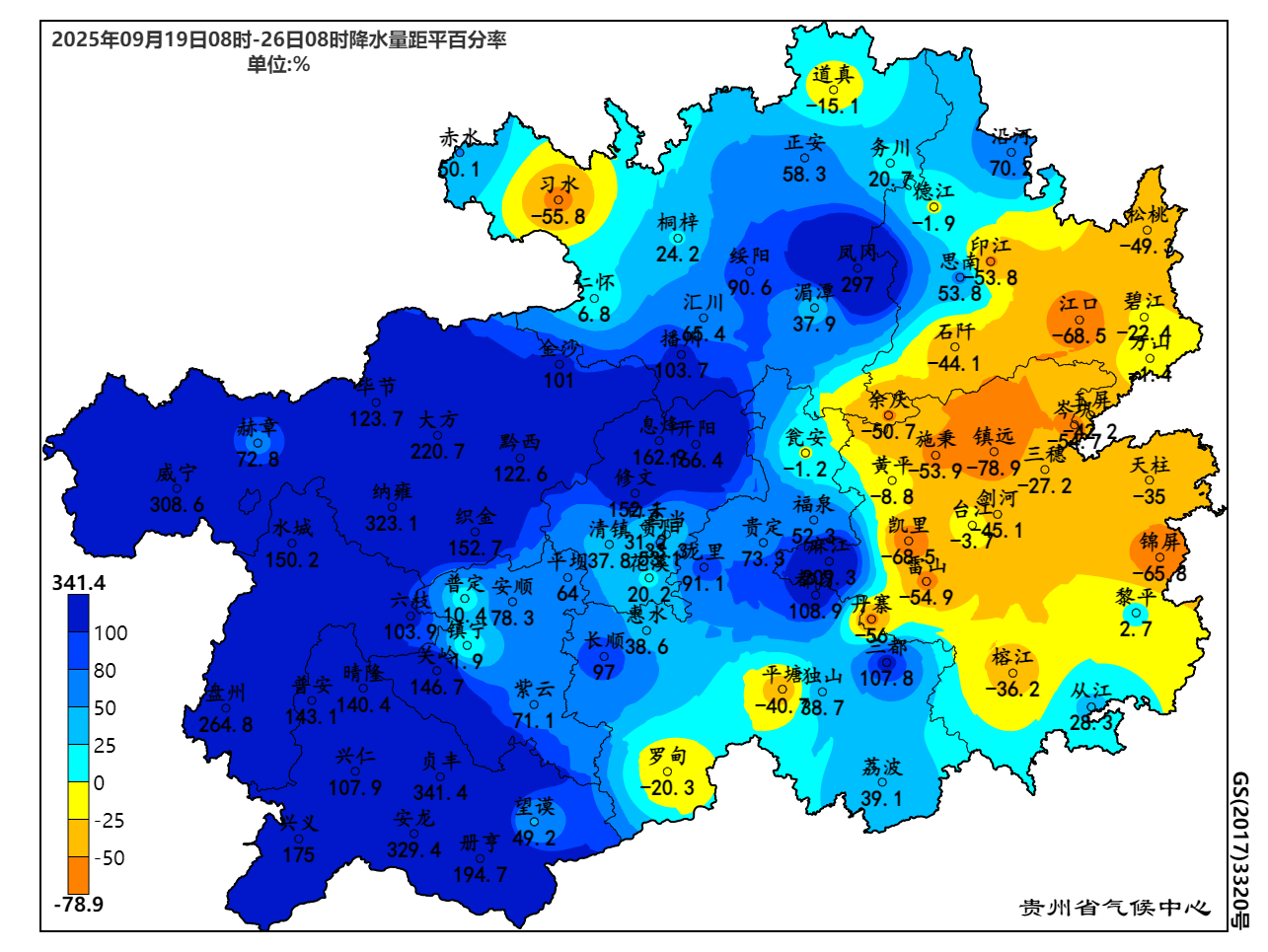 图2贵州省2025年9月19日08时—26日08时降水量及其距平百分率分布