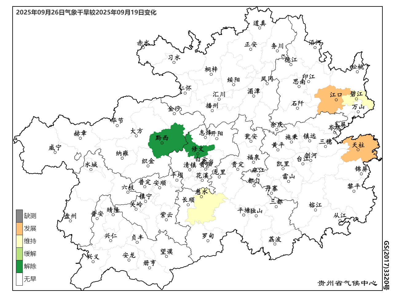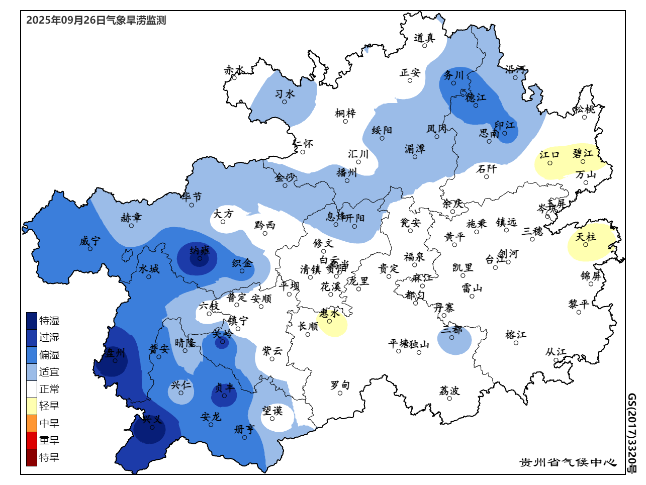 据9月26日气象旱涝监测,全省出现特湿3站(兴义、纳雍、盘州),过湿2站(贞丰、关岭),偏湿9站(册亨、安龙、织金、印江、德江、务川、普安、水城、威宁),轻旱4站(惠水、天柱、碧江、江口)。较上周,修文和黔西气象干旱解除,惠水和碧江气象干旱维持,江口和天柱气象干旱有所发展。