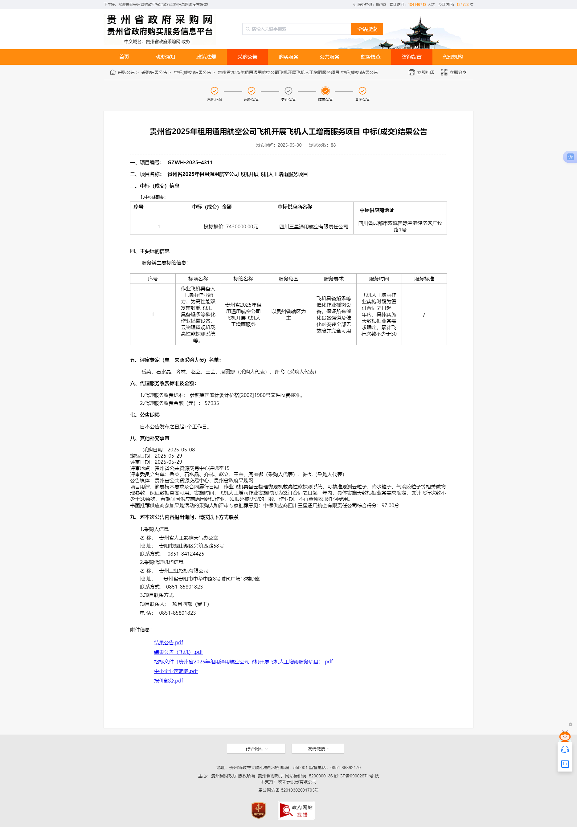贵州省2025年租用通用航空公司飞机开展飞机人工增雨服务项目中标(成交)结果公告